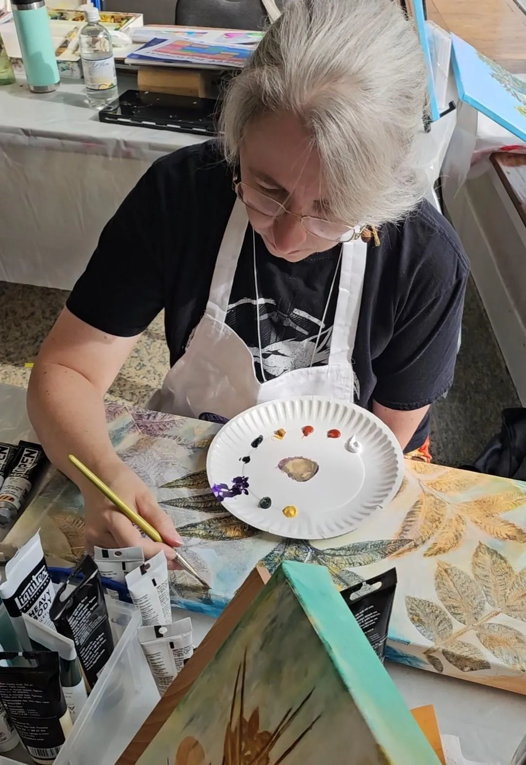 To refine my craft, I completed the first half of the Evolve Artist program, a rigorous oil-painting curriculum, and am now advancing through its second level. The foundational skills gained—control of value, edge, and color—elevate all my work. Recently, I’ve embraced Gelli printing with acrylics, thriving in its bold textures and incorporating the technique into botanical mixed-media pieces.